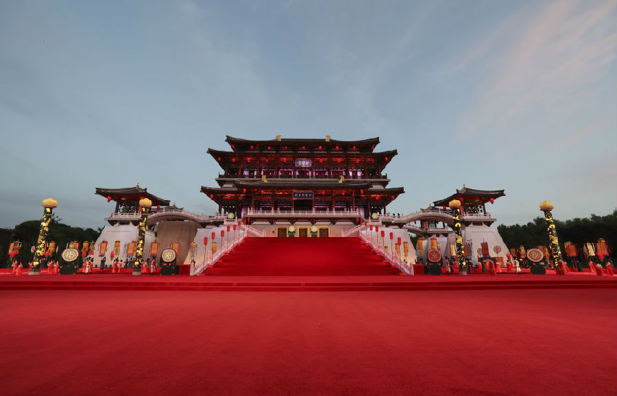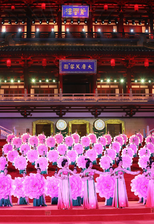 习近平夫妇为贵宾举行唐朝传统迎宾仪式。紫云楼前,礼乐和鸣,明快有力的古代佾舞、绚丽婀娜的芙蓉花舞,表达了古都西安人民的热情好客,体现了中华文化兼容并蓄的精神风貌。