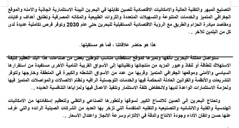 大使先生紧接着介绍了当今巴中两国关系。他说:“如今,巴林与中国之间的关系是古老关系与二者之间经济、商业与文化关系的延续,这体现在两国公共和私营企业之间的商业交流与多家中国领先企业在巴林加大投资以及多个地区办事处的开设。随着哈马德·本·尔萨·阿勒哈利法国王陛下 -愿真主帝保佑他- 于2013年对友好的中华人民共和国主席习近平阁下历史性访问取得的巨大成果,使我们两国之间的关系提升到更高水平、前景更为广阔、涉及各个领域。如今,中国精益求精的制造业、高端科技、经济潜力以及巴林具有吸引力和安全性的投资环境、独特的地理位置、多样化的服务、众多的便利性、丰富的自然资源、地理优越的银行业以及‘一带一路’倡议与巴林2030远景高度一致的战略目标,两国以此为纽带的经济发展合作伙伴关系将两国紧密的联系在一起,双方形成优势互补。”