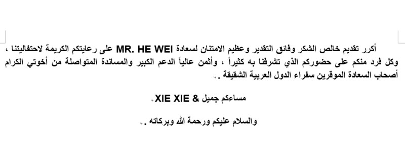 大使先生最后指出:“愿真主保佑我们所有的努力,无论是现在还是未来都非常感谢大家对我们两个友好国家——巴林和中国,以及两国亲密人民之间的关系发展做出的巨大贡献。我向大家承诺,巴林驻华使馆、以OSCAR CHOW先生为领导的巴林王国驻香港名誉领事馆,以及由蒋赟先生负责的巴林王国驻北京深圳经济发展委员会,将永远是连接两国友谊和公共与私营企业可持续合作的桥梁,为加强我们的友好关系,发展合作不懈努力的有效机构。我再次感谢何维先生对我们庆祝活动的光临与支持,我高度赞赏尊贵的兄弟们和阿拉伯使节的大力支持!”