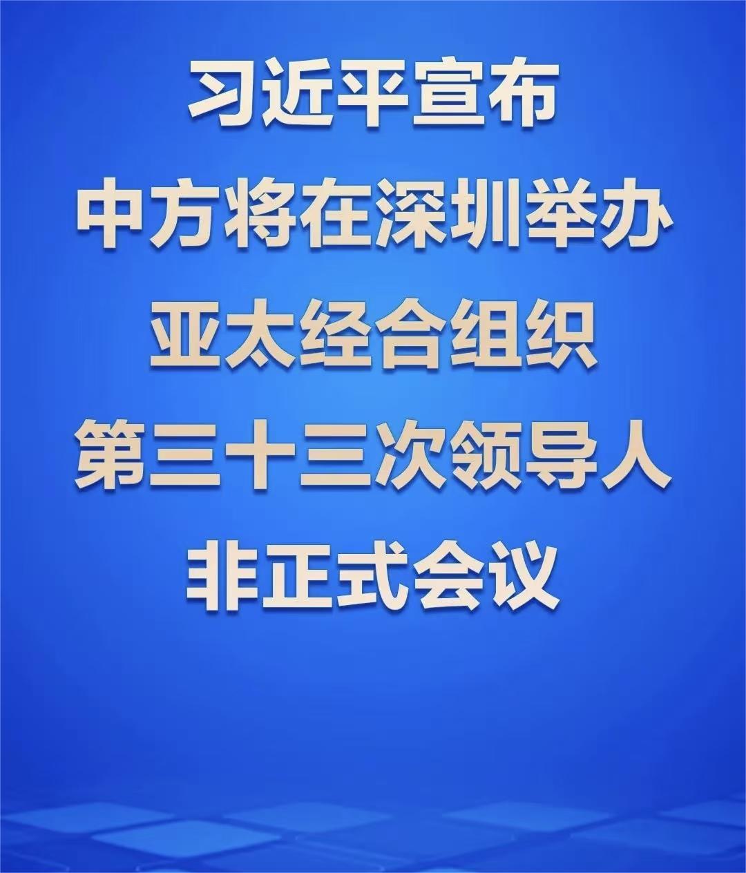 当地时间11月1日上午,国家主席习近平出席亚太经合组织第三十二次领导人非正式会议东道主交接环节,宣布中方将于明年11月在广东省深圳市举办亚太经合组织第三十三次领导人非正式会议。