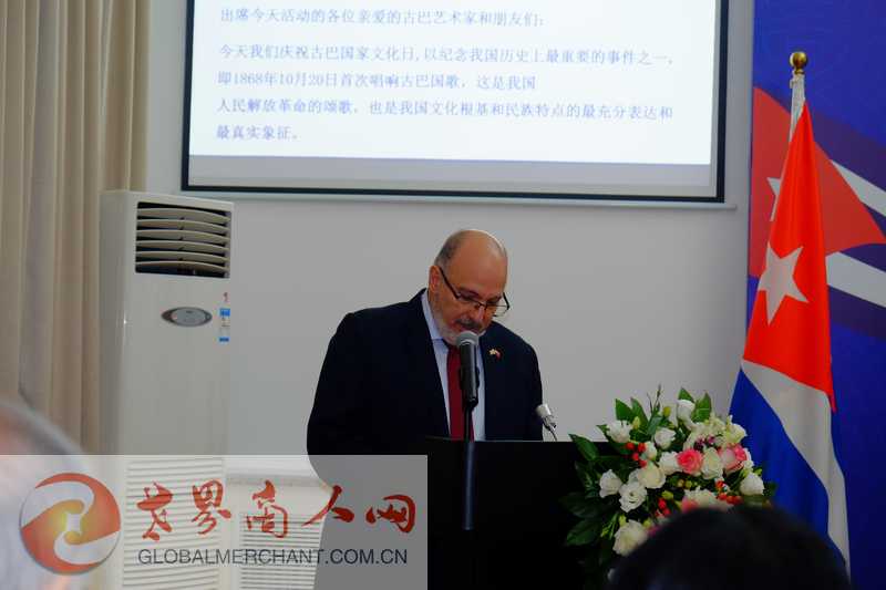 首先起立、奏古巴国歌。古巴驻华大使白诗德阁下接着致辞。他说:“尊敬的副总理兼外贸外资部部长阁下,尊敬的中国政府文化部门代表,今天我们齐聚一堂,举行古巴文化日庆祝活动,以纪念古巴历史上最重要的事件之一,即1868年10月20日首次唱响古巴国歌。这是我国解放人民的颂歌。也是我国文化、经济和民族和解的最充分表达、最真实的象征。