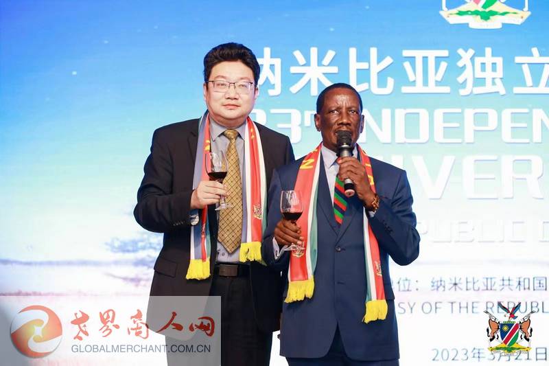旋即, 纳米比亚驻华大使与周平先生与一道,端起酒杯,倡议各位嘉宾朋友们一起举起酒杯,为了纳米比亚总统哈格·盖恩戈布博士的健康、为了中国和纳米比亚友谊万岁干杯!