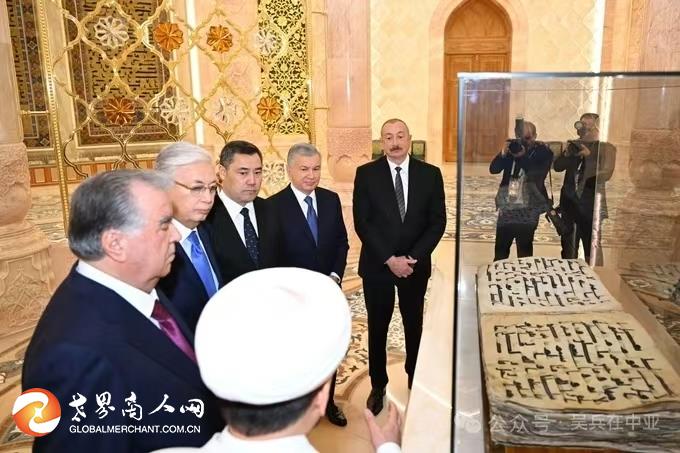 1115日,阿塞拜疆总统伊利哈姆·阿利耶夫、哈萨克斯坦卡西姆-乔马尔特·托卡耶夫、吉尔吉斯斯坦萨迪尔·贾帕罗夫、塔吉克斯坦埃莫马利·拉赫蒙总统,在总统沙夫卡特·米尔济约耶夫的陪同下,参观了保存着古兰经最古老手稿之一的奥斯曼穆沙夫的古兰经大厅。